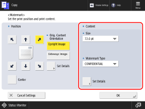 Você pode pressionar [Set Details] para alterar as páginas nas quais imprimir a marca d'água ou alterar o método de impressão (impressão transparente ou sobreposta).