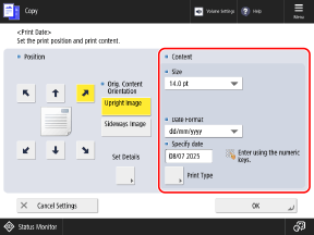 Adiciona a data (ano, mês e dia) ao copiar. Você pode especificar a data a ser impressa.