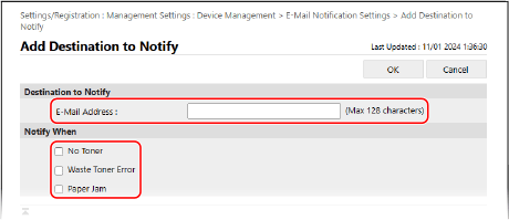 Os destinos de aviso registrados são adicionados à lista de destinos de avisos na tela [E-Mail Notification Settings].