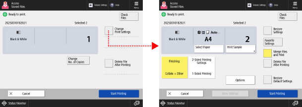 Pressione [Change Print Settings] na parte superior direita da tela para definir as seguintes configurações: