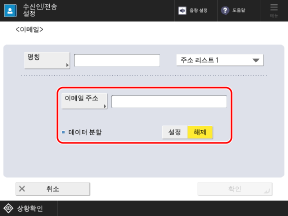 이메일 수신인을 주소록 또는 원터치 버튼에 등록하는 경우 아래에서 설명하는 항목을 구성합니다.