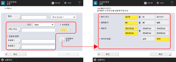 팩스 수신인을 주소록 또는 원터치 버튼에 등록하는 경우 아래에서 설명하는 항목을 구성합니다.