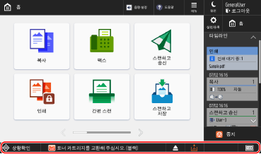 ![]() | [상황확인] [작업상황/이력]을 선택하여 각 기능의 처리 상태 및 이력, 소모품과 부품의 잔량을 확인할 수 있습니다. [조작상황]을 선택하여 기기 및 작동 상태, 문제의 원인, 문제 해결 방법을 확인할 수 있습니다. |