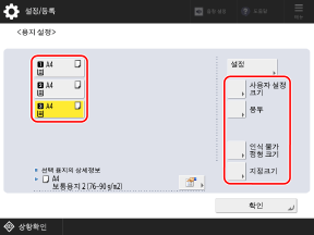설정을 변경하려는 급지위치를 선택하고 용지 크기를 설정합니다.
