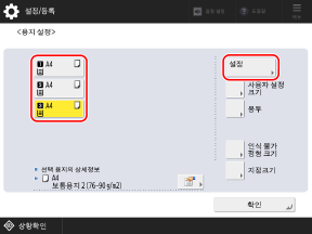 설정을 변경하려는 용지 카세트를 선택하고 [설정]을 누릅니다.