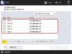 주소록에 등록된 수신인(개인 주소 리스트 또는 사용자 그룹 주소 리스트에 있는 수신인 제외)을 통지처로 설정할 수 있습니다.