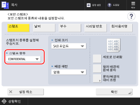 [보안 스탬프] 화면에서 구성된 설정은 샘플 인쇄의 문자 형식에 적용됩니다.