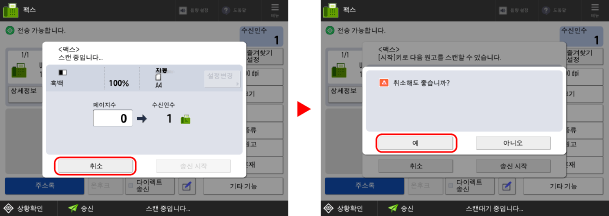 기기에서 팩스를 송신하는 경우에는 화면 지시에 따라 팩스 송신 작업을 취소할 수 있습니다.