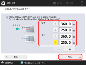 1단계에서 이미지 일부가 용지에 인쇄되지 않는 경우, 계산한 확대 또는 축소 비율을 [배율 (f)]과 [배율 (d)]에 입력하고 [확인]을 누릅니다.