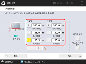 용지 가장자리와 표시자 중앙선 사이의 이동량을 확인하고 해당하는 값을 입력한 다음 [확인]을 누릅니다.