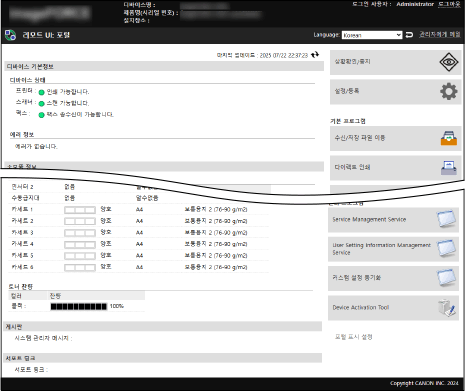 리모트 UI에 로그인하면 포털 페이지(리모트 UI TOP 페이지)가 표시됩니다. 버튼을 클릭하여 기기의 작동 상태를 확인하고, 다양한 정보를 보고, 설정을 변경할 수 있습니다.