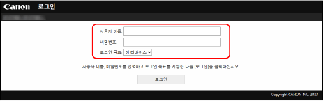 리모트 UI를 사용하려면 기기의 IP 주소를 컴퓨터의 웹 브라우저에 입력하고 관리자 또는 일반 사용자로 로그인합니다. 리모트 UI로 사용할 수 있는 기능은 로그인 사용자의 권한에 따라 다릅니다.