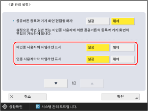 각 사용자가 [홈] 화면에서 설정할 수 있는 항목을 제한하려면 [설정]을 누르고, 제한할 각 항목마다 [해제]를 선택한 후 [확인]을 누릅니다.