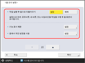 각 사용자가 [홈] 화면에서 설정할 수 있는 항목과 [홈] 화면에서 기능과 설정 버튼을 표시할지 여부 같은 설정을 구성할 수 있습니다.