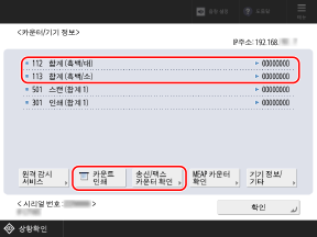 [송신/팩스 카운터 확인]을 눌러 스캔하고 송신한 페이지 수와 팩스로 송신한 페이지 수를 확인합니다.