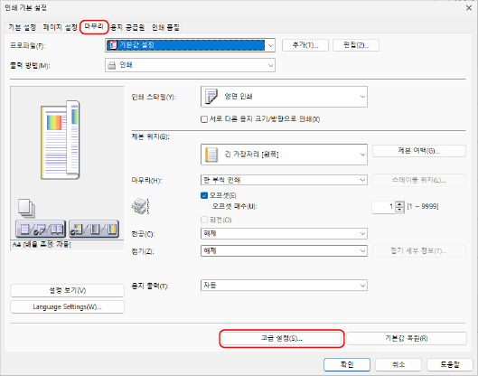 프린터 드라이버의 [인쇄 기본 설정] 화면을 표시합니다. 인쇄