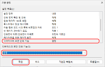 [디바이스의 안전한 인쇄 기능]을 클릭하고 [설정]을 선택한 뒤 [확인]을 클릭합니다.