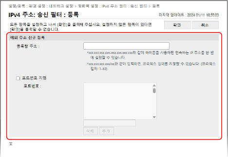 등록된 IP 주소로 통신할 때 특정 포트번호를 사용하는 통신에만 예외 주소를 설정하려면 이 확인란을 선택하고 포트번호를 리스트에 추가합니다.