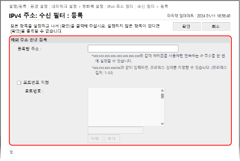 예외 주소가 등록되고, IP주소 필터 설정을 구성하는 화면이 다시 표시됩니다.