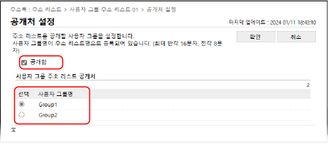 사용자 그룹 주소 리스트를 등록된 사용자 그룹에 공개할 수 있습니다. 사용자는 자신이 속한 사용자 그룹에 공개된 주소 리스트를 사용할 수 있습니다.