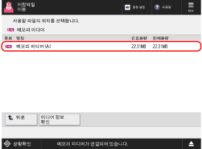 [미디어 정보 확인]을 누르고, USB 메모리 장치를 선택한 후, [상세정보]를 눌러 USB 메모리 장치의 시리얼 번호와 기타 정보를 확인합니다.