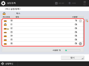 [파일 자동삭제까지의 시간] 및 [프린터 드라이버로부터 저장시 인쇄] 설정을 모든 메일함에 동시에 구성할 수 있습니다.
