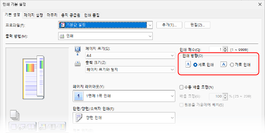 [기본 설정] 탭의 [인쇄 방향]에서 [인쇄 방향]이