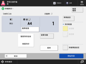 目前設定要使用的紙張以及列印份數顯示在畫面中央。檢查這些設定以確保正確列印。
