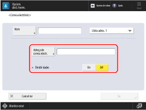 Quan deseu una destinació de correu electrònic a la llibreta d'adreces o en un botó d'accés ràpid, configureu els elements que es descriuen a continuació.