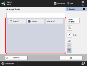Podeu especificar les destinacions desades a la llibreta d'adreces recuperant la llibreta d'adreces des de les pantalles de lectura (Llegir i enviar) o de fax del tauler de control.