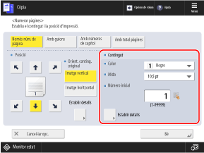 Podeu prémer [Establir detalls] i configurar les opcions per afegir una cadena de caràcters personalitzada als números de pàgina, o bé indicar l'interval de pàgines que vulgueu imprimir.