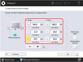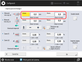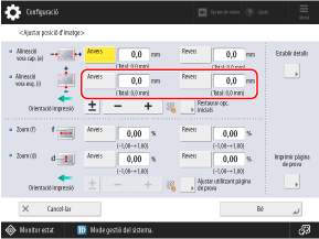 * Quan mostreu la pantalla [Ajustar posició d'imatge] després d'ajustar l'alineació de la vora esquerra o d'ajustar l'alineació de la vora superior, el valor de la pantalla es restableix a "0,0 mm", però es conserva el valor establert anteriorment. Si voleu repetir l'ajust, comproveu l'indicador de la pàgina de prova reimpresa i configureu aquest valor.