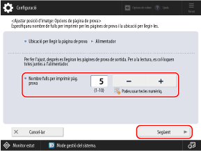 Establiu el nombre de fulls de pàgines de prova que s'imprimiran i, després, premeu [Següent].