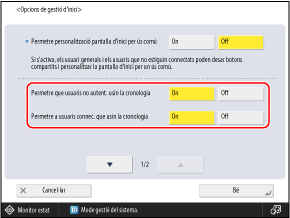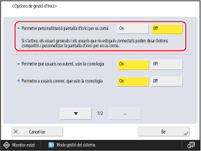 Establiu l'opció en [On] per permetre que els usuaris que no siguin administradors puguin afegir botons compartits i fer canvis a les opcions de [Personalitzar per ús comú].