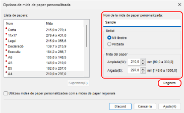 Introduïu el nom del paper de mida personalitzada i la mida del paper i feu clic a [Registra].