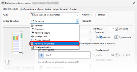 Podeu configurar la impressió programada a les opcions d'impressió del controlador i enviar les dades d'impressió a l'equip.