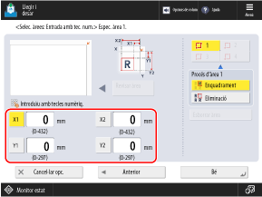 3, premeu [Entrada amb tecles num.] i especifiqueu l'interval utilitzant les tecles numèriques per introduir els valors de [X1] com a [Y2] amb la part superior dreta de l'original com a punt de referència.