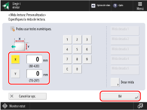 Premeu [Especificar per mida]. Seleccioneu [Igual escala per a XY] o [XY independents], especifiqueu la mida de l'original i la mida d'impressió de les dades (mida de paper de les dades llegides) en increments d'1 mm (1/16") i premeu [Bé].