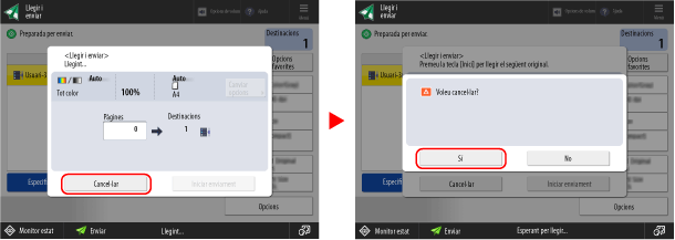 Per cancel·lar un altre treball, premeu [Compr. altres treballs], seleccioneu el treball que voleu cancel·lar a Llista de treballs d'enviament i premeu [Cancel·lar].