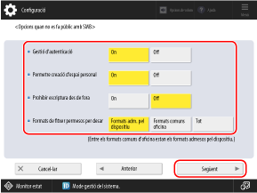 * Quan s'estableix en [On], no és possible connectar-se a l'Espai avançat des d'un sistema operatiu client que no admeti la comunicació amb xifratge SMB 3.0.