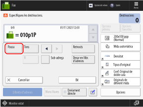 Quan envieu un fax a una destinació internacional, introduïu el número d'accés internacional, el codi de país i el número de fax de la destinació en aquest ordre. Premeu [Pausa] entre els números per afegir una pausa.
