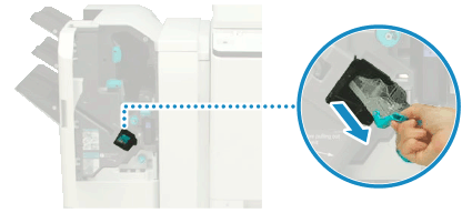 En aquesta secció es descriu com eliminar els encallaments de grapes a la unitat grapadora de quaderns. Seguiu les instruccions del tauler de control per comprovar la ubicació de la grapa i treure la grapa encallada.