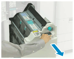 Aquesta secció descriu com eliminar encallaments de grapes a la Staple Finisher-AC. Seguiu les instruccions del tauler de control per comprovar la ubicació de la grapa i treure la grapa encallada.