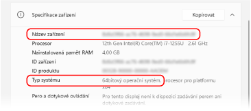 V části [Specifikace zařízení] zkontrolujte název počítače a verzi operačního systému.