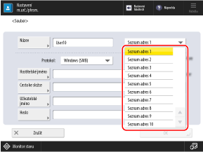 Na obrazovce skenování (Skenovat a Odeslat) nebo faxu můžete stisknutím [Adresář] zaregistrovat cíl z obrazovky adresáře.