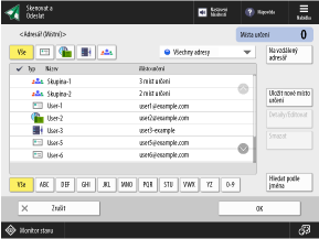 Když na obrazovce pro skenování nebo faxování vyvoláte adresář, zobrazí se příslušná obrazovka uvedená níže.