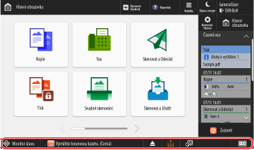 Když vyberete [Stav/Výpis úloh], můžete zkontrolovat stav a historii zpracování každé funkce a zbývající množství spotřebního materiálu a dílů.