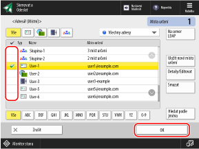 Místa určení uložená v adresáři můžete zadat vyvoláním adresáře na obrazovce (Skenovat a Odeslat) nebo na obrazovce faxování na ovládacím panelu.