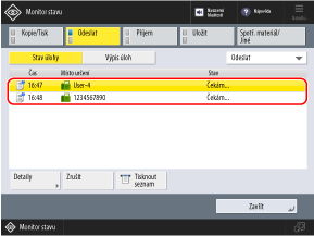 Stiskněte možnost [Odeslat] nebo [Příjem] a poté možnost [Stav úlohy].
