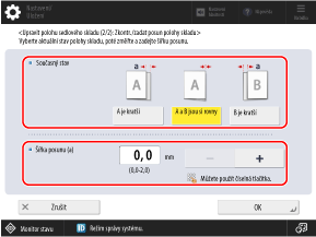 Zkontrolujte aktuální stav polohy skladu a šířku posunu na testovacím výtisku, poté vyberte aktuální stav a nastavte šířku posunu.